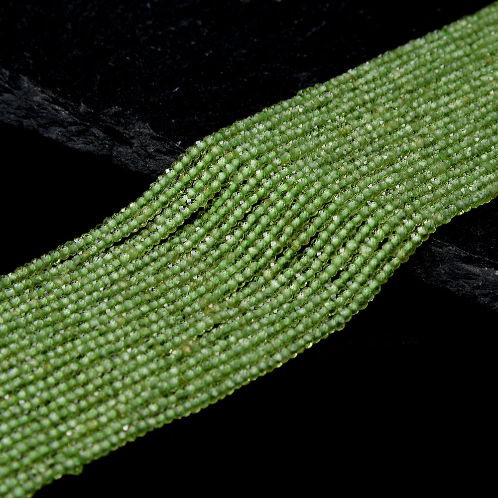 Peridot Gemstone, Micro Faceted Rondelle shaped, measures approximately 2X1MM , features a wonderful luster with excellent polish. Drilled hole. Color, tone, and quality of these Peridot beads are well matched on strand.