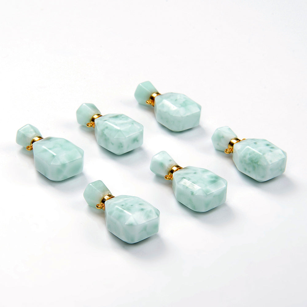 Green Moonstone Gemstone, Perfume Bottle Pendant Faceted, Essential Oil Bottle shaped, measures approximately 35X18X13MM , features a wonderful luster with excellent polish. Drilled hole. Color, tone, and quality of these Green Moonstone beads are well matched on strand.