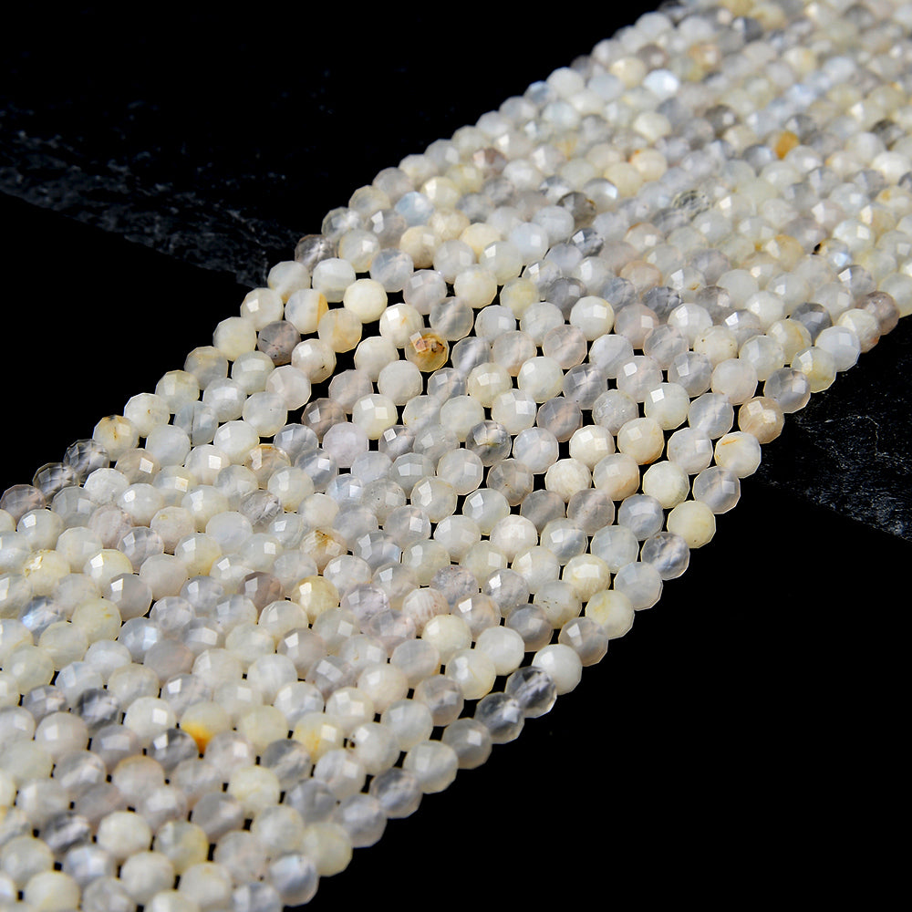White Moonstone Gemstone, Micro Faceted Round shaped, measures approximately 3MM , features a wonderful luster with excellent polish. Drilled hole. Color, tone, and quality of these White Moonstone beads are well matched on strand.
