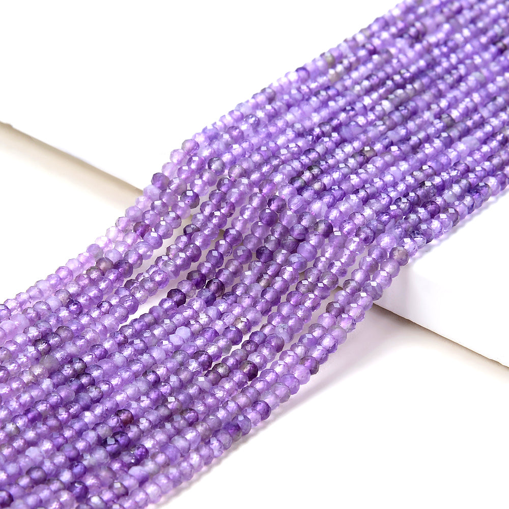 Amethyst Gemstone, Micro Faceted Rondelle shaped, measures approximately 3X2MM , features a wonderful luster with excellent polish. Drilled hole. Color, tone, and quality of these Amethyst beads are well matched on strand.