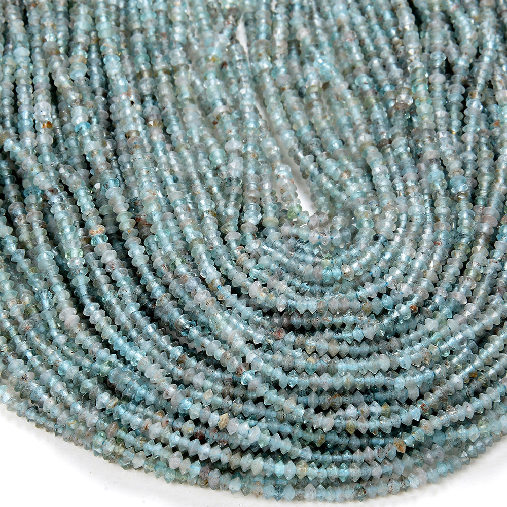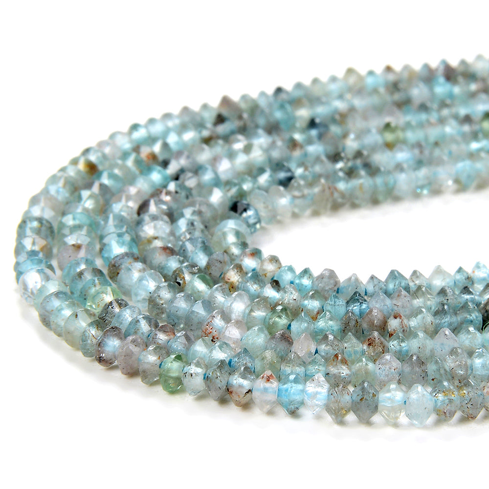 Apatite Gemstone, Bicone Faceted Rondelle Saucer shaped, measures approximately 3X2MM , features a wonderful luster with excellent polish. Drilled hole. Color, tone, and quality of these Apatite beads are well matched on strand.