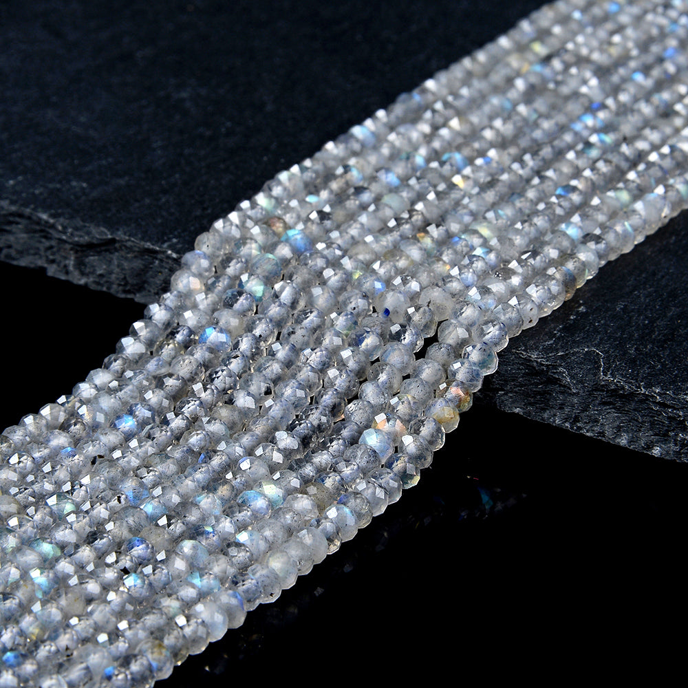 Labradorite Gemstone, Micro Faceted Rondelle shaped, measures approximately 3X2MM , features a wonderful luster with excellent polish. Drilled hole. Color, tone, and quality of these Labradorite beads are well matched on strand.