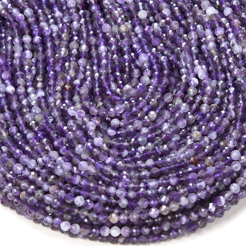 Amethyst Gemstone, Micro Faceted Round shaped, measures approximately 4MM , features a wonderful luster with excellent polish. Drilled hole. Color, tone, and quality of these Amethyst beads are well matched on strand.