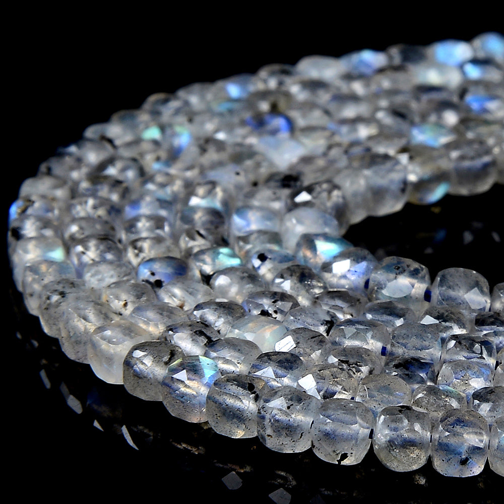 Labradorite Gemstone, Micro Faceted Square Cube shaped, measures approximately 4MM , features a wonderful luster with excellent polish. Drilled hole. Color, tone, and quality of these Labradorite beads are well matched on strand.
