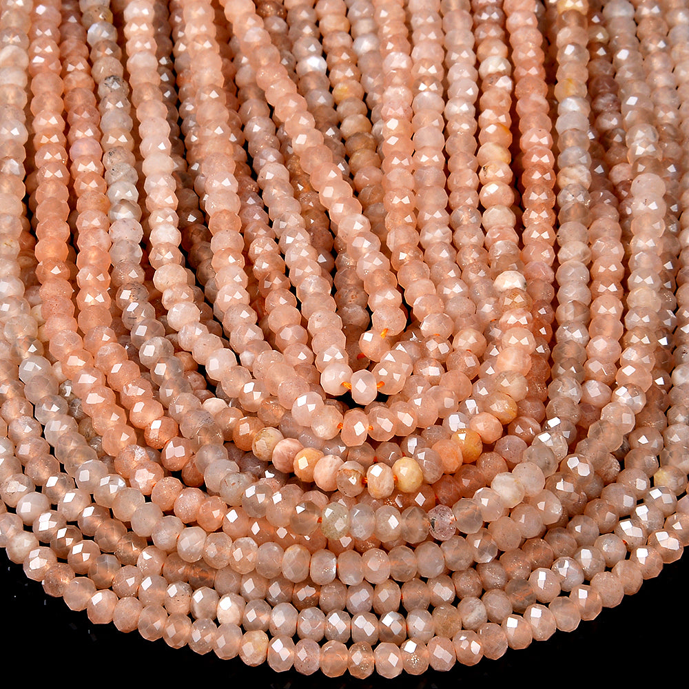 Sunstone Gemstone, Micro Faceted Rondelle shaped, measures approximately 4X3MM , features a wonderful luster with excellent polish. Drilled hole. Color, tone, and quality of these Sunstone beads are well matched on strand.