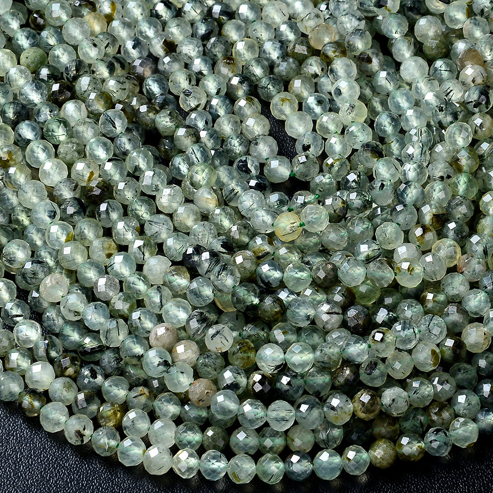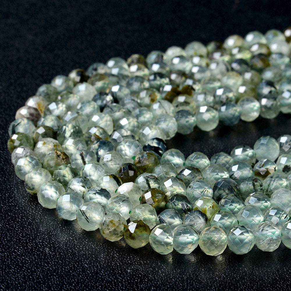 Prehnite Gemstone, Micro Faceted Round shaped, measures approximately 5-6MM , features a wonderful luster with excellent polish. Drilled hole. Color, tone, and quality of these Prehnite beads are well matched on strand.