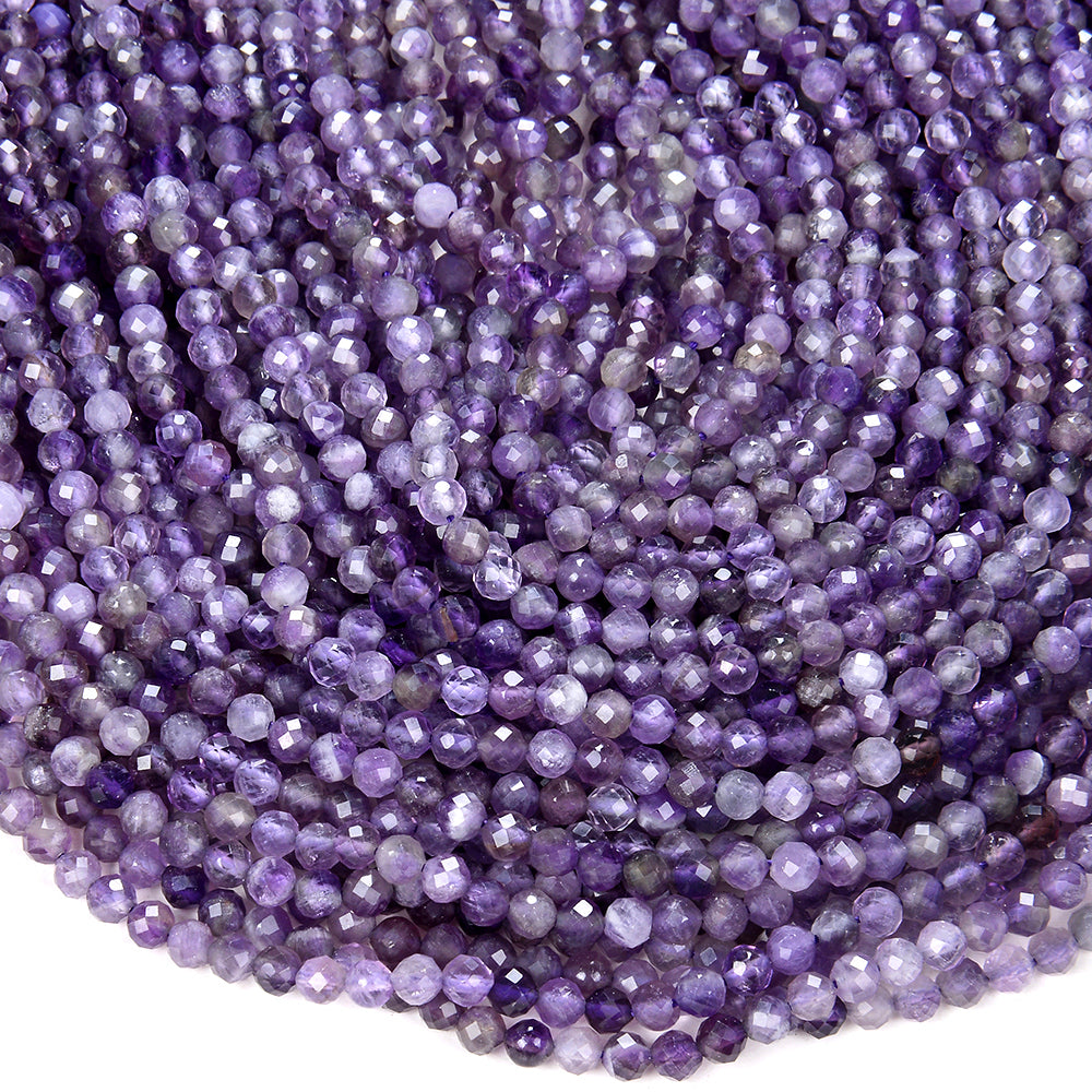 Amethyst Gemstone, Micro Faceted Round shaped, measures approximately 5MM , features a wonderful luster with excellent polish. Drilled hole. Color, tone, and quality of these Amethyst beads are well matched on strand.
