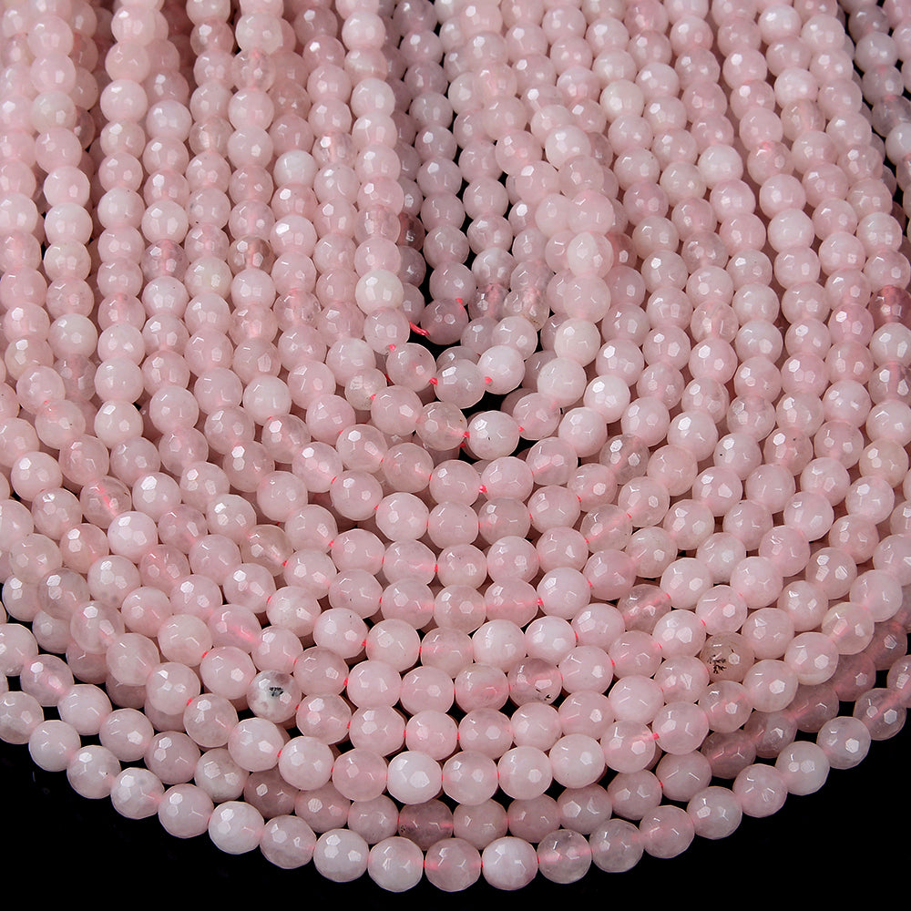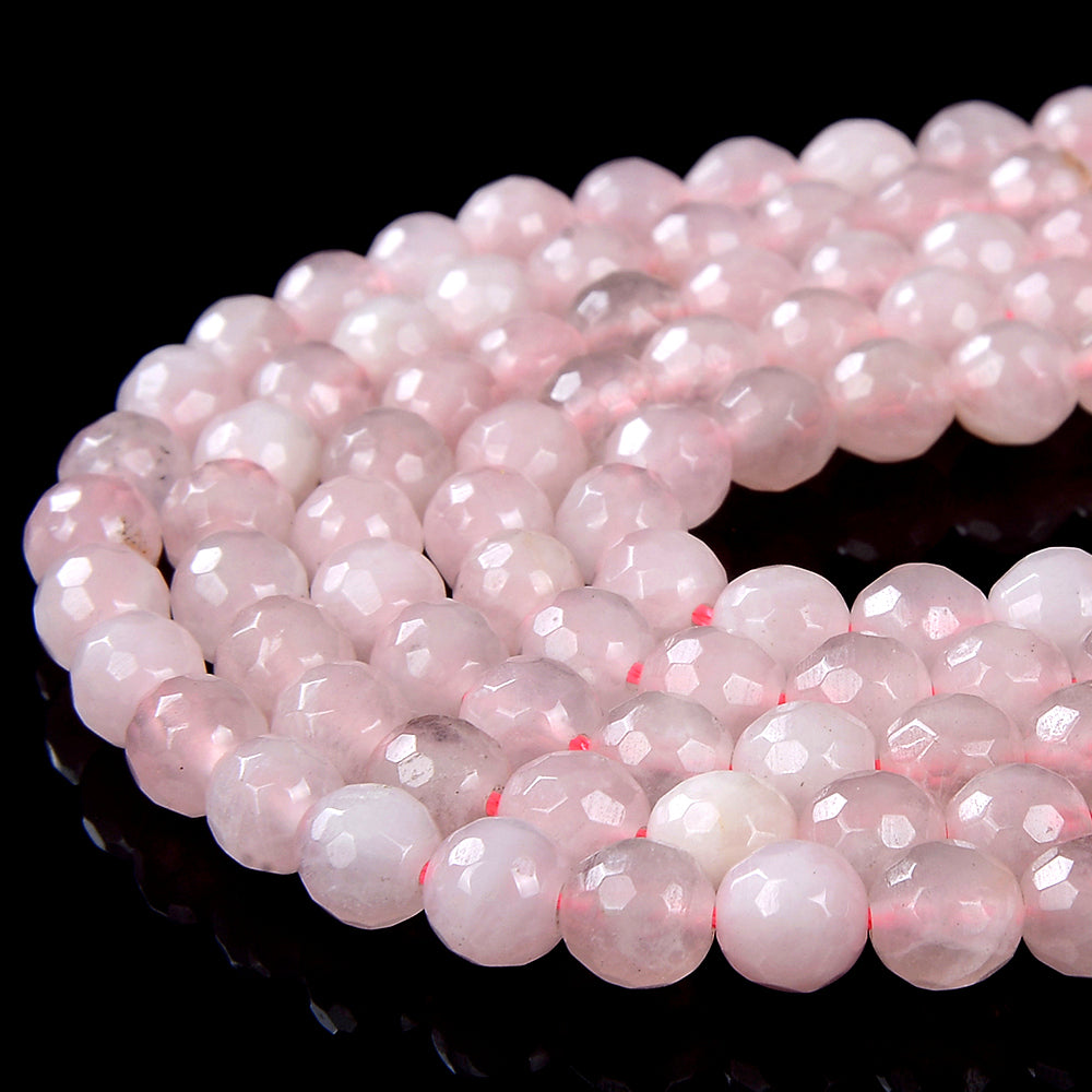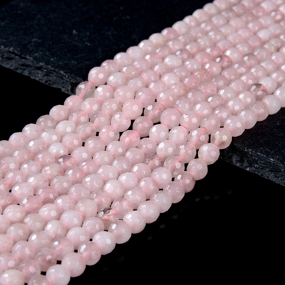 Madagascar Rose Quartz Gemstone, Faceted Round shaped, measures approximately 6MM , features a wonderful luster with excellent polish. Drilled hole. Color, tone, and quality of these Madagascar Rose Quartz beads are well matched on strand.