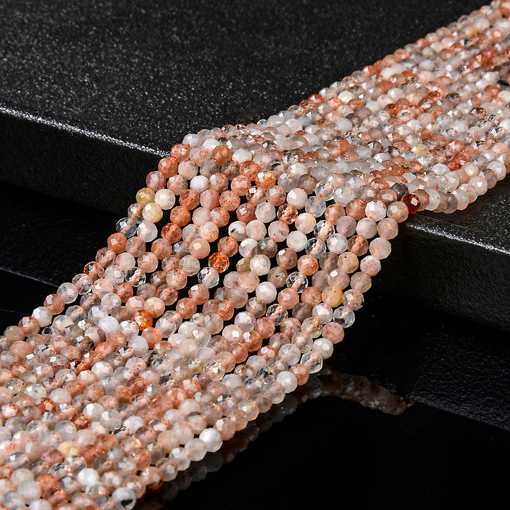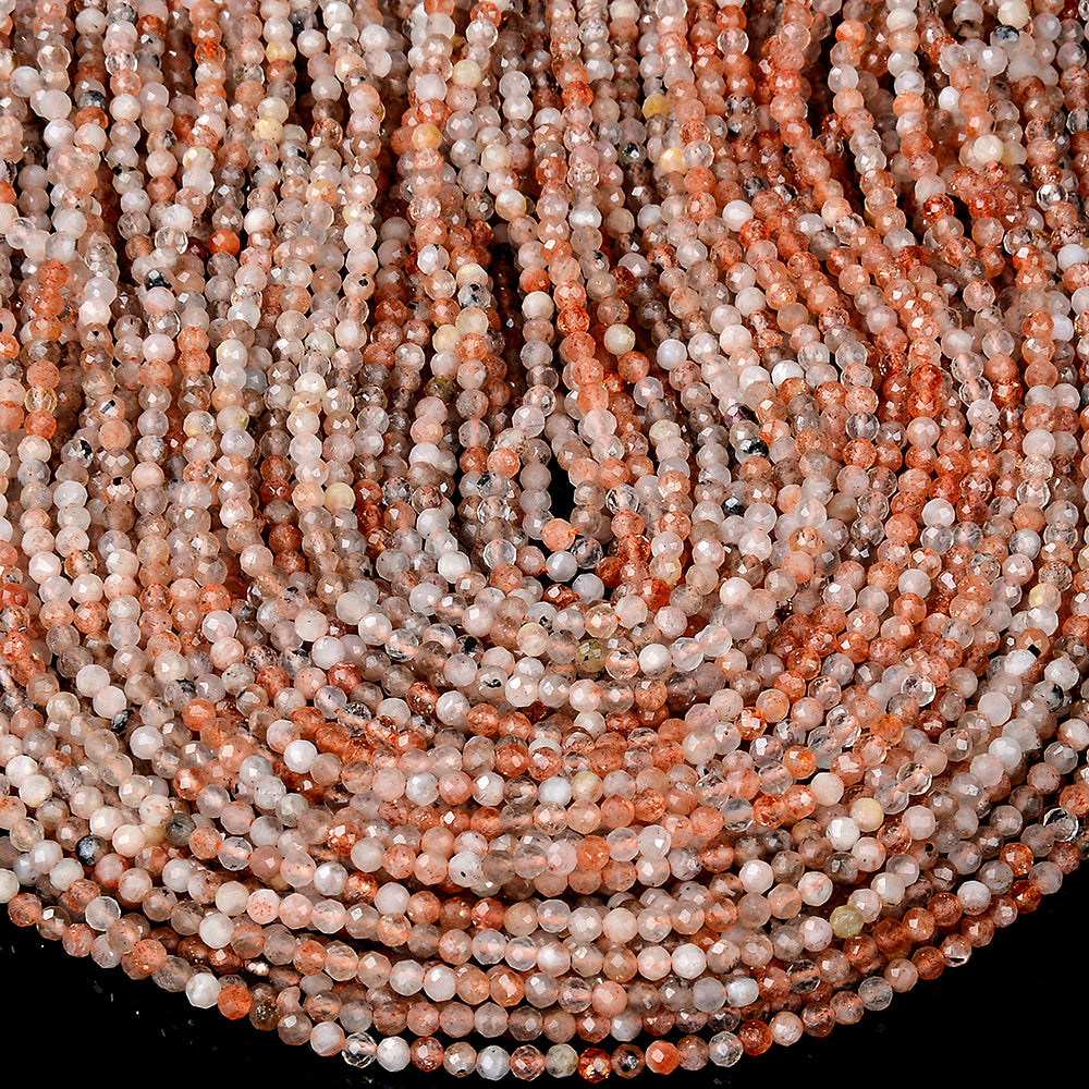 Rainbow Lattice Sunstone Gemstone, Micro Faceted Round shaped, measures approximately 3MM , features a wonderful luster with excellent polish. Drilled hole. Color, tone, and quality of these Rainbow Lattice Sunstone beads are well matched on strand.