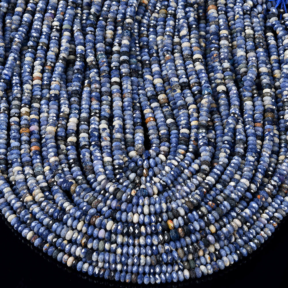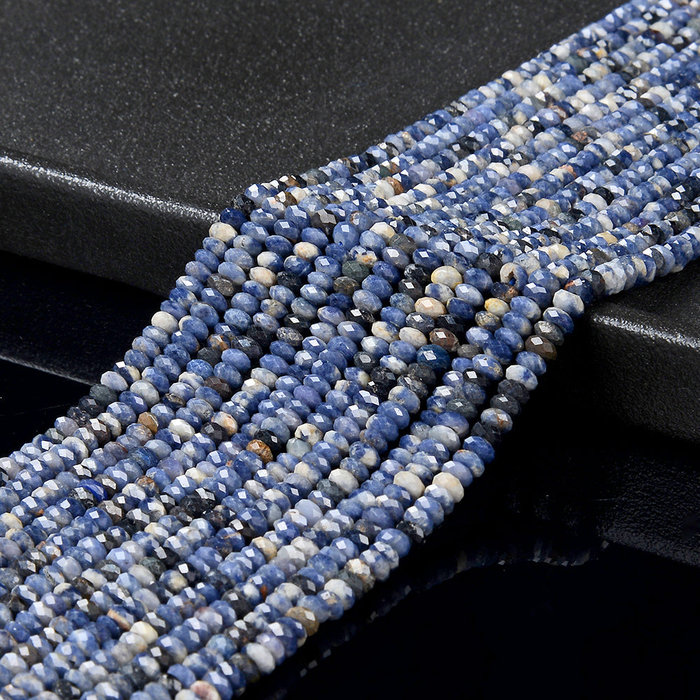 Sapphire Gemstone, Micro Faceted Rondelle shaped, measures approximately 4X2MM , features a wonderful luster with excellent polish. Drilled hole. Color, tone, and quality of these Sapphire beads are well matched on strand.