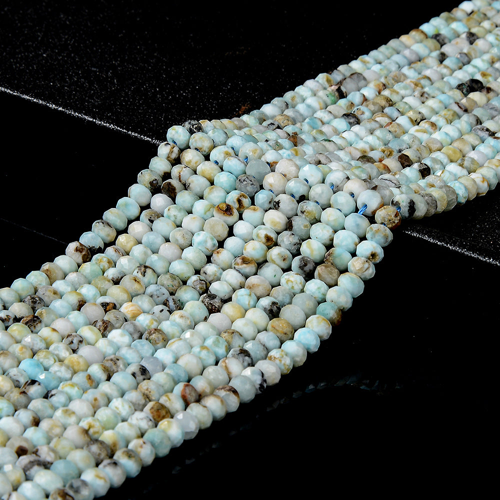 Larimar Gemstone, Micro Faceted Rondelle shaped, measures approximately 5X3MM , features a wonderful luster with excellent polish. Drilled hole. Color, tone, and quality of these Larimar beads are well matched on strand.