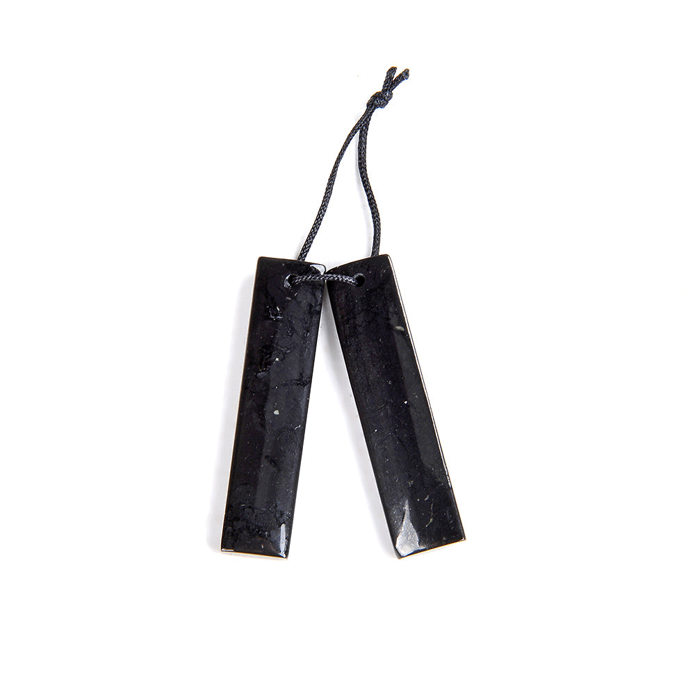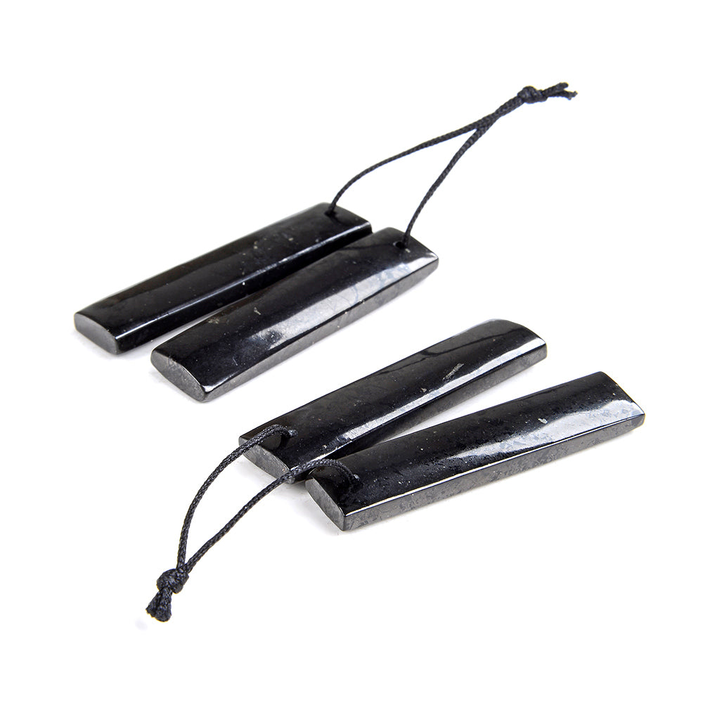 Shungite Gemstone, Rectangle Earring Pair Pendant shaped, measures approximately 10X45MM , features a wonderful luster with excellent polish. Drilled hole. Color, tone, and quality of these Shungite beads are well matched on strand.