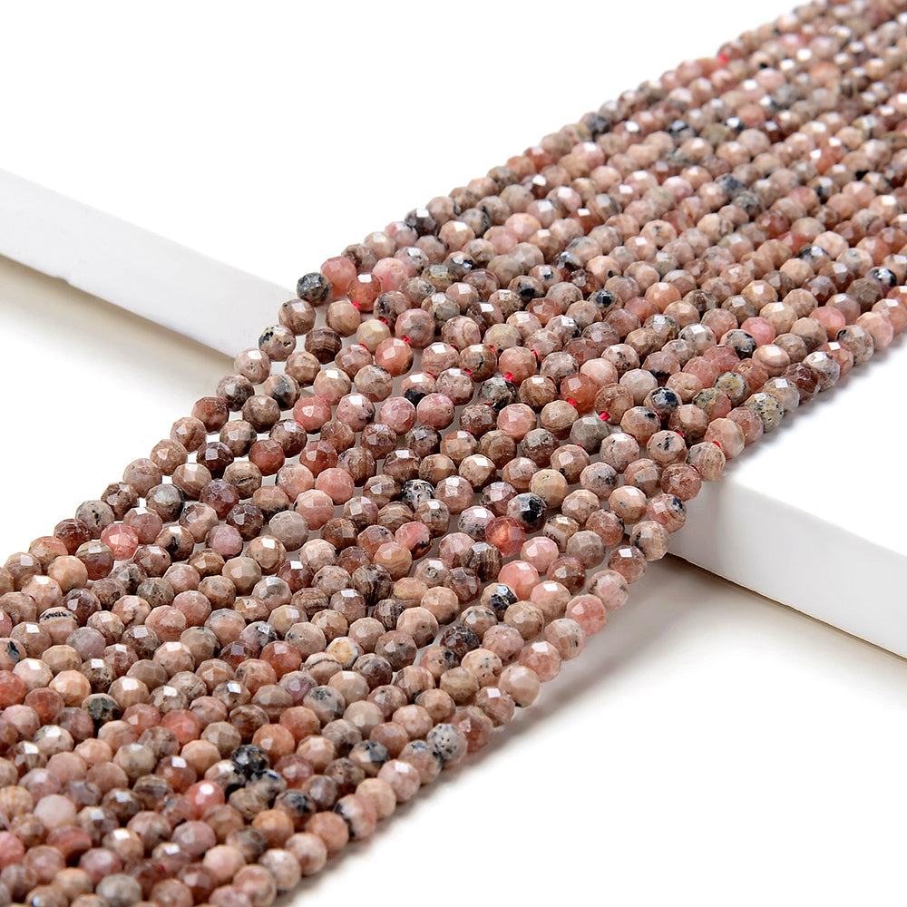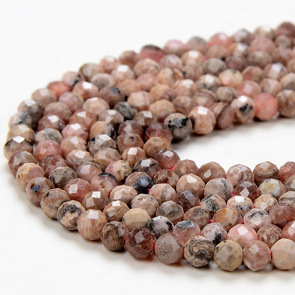 Rhodochrosite Gemstone, Micro Faceted Round shaped, measures approximately 2MM , features a wonderful luster with excellent polish. Drilled hole. Color, tone, and quality of these Rhodochrosite beads are well matched on strand.