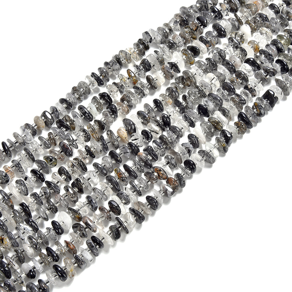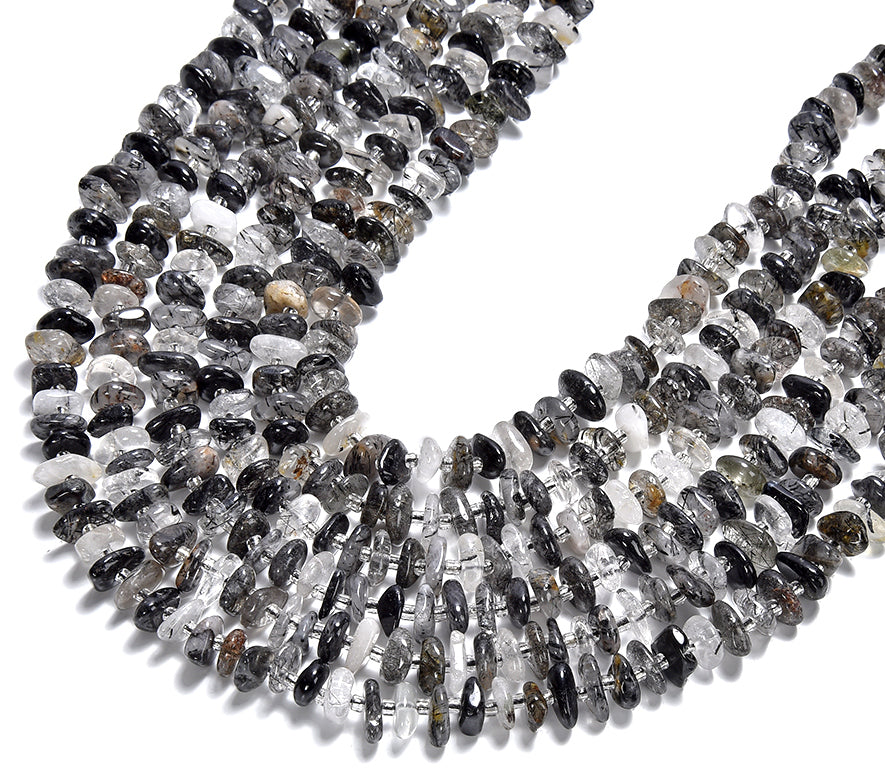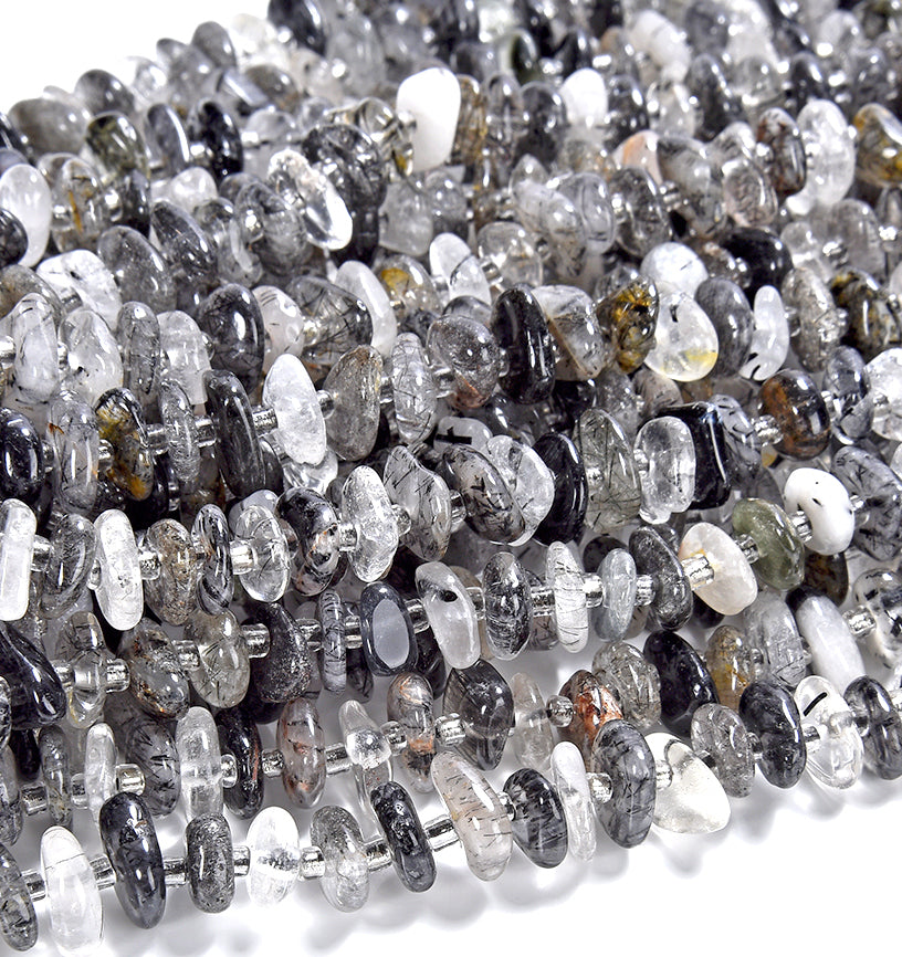 Natural Black Tourmaline Rutilated Quartz Gemstone Pebble Nugget Freeform Rondelle 8-10MM Loose Beads (D558)